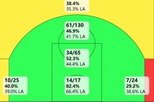 美媒晒出了保罗上赛季的投篮热图,他上赛季在三分线内的各个区域命中率都高于联盟平均水平,82场比赛篮下仅出手17次,但命中率14个,命中率高达82.4%,远高于联盟平均的66.4%。
